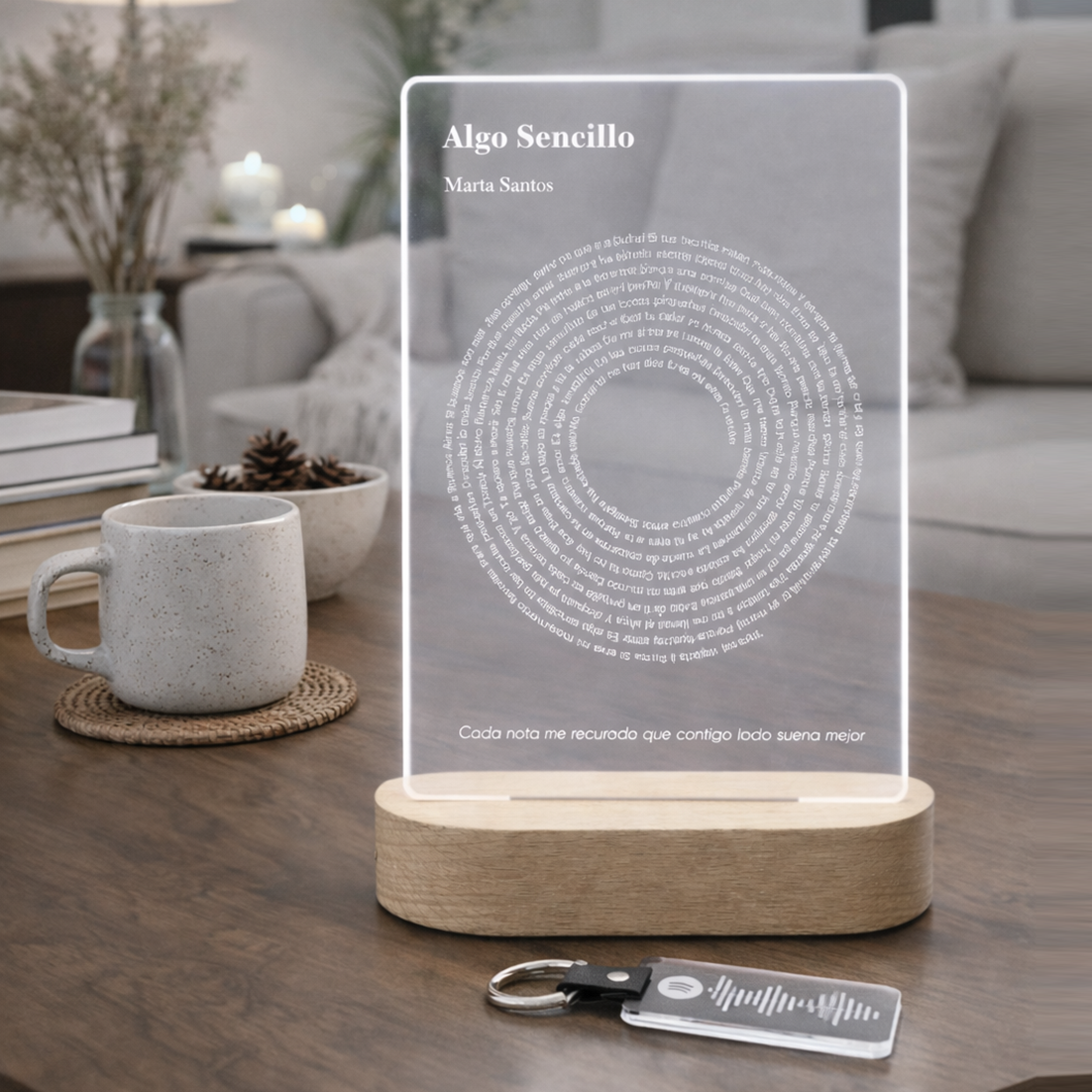 Se apoya sobre una peana de madera natural con luz LED, que realza el diseño y crea un ambiente cálido y acogedor 🌿💡