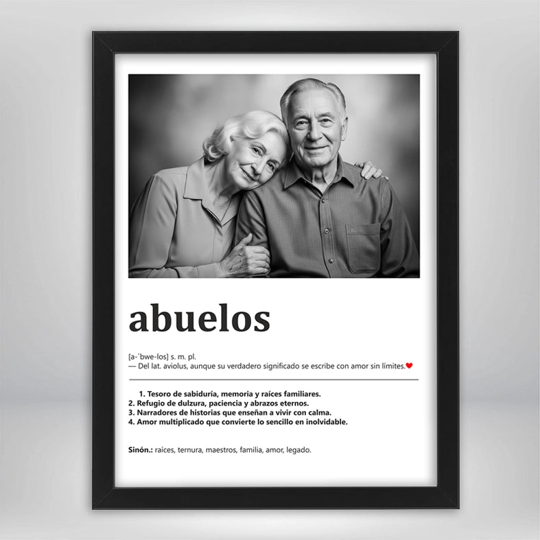 Celebra el amor y la sabiduría de los abuelos con este cuadro único 🖼️✨. Una impresión de alta calidad que captura la esencia de la palabra "Abuelos" junto a una emotiva definición 💖👵👴. El regalo perfecto para expresar gratitud y cariño, y para recordar esos momentos inolvidables en familia 🎁🌟. Ideal para decorar cualquier espacio con un toque de ternura y significado profundo. ¡Haz que sus recuerdos vivan para siempre! 📸❤️
