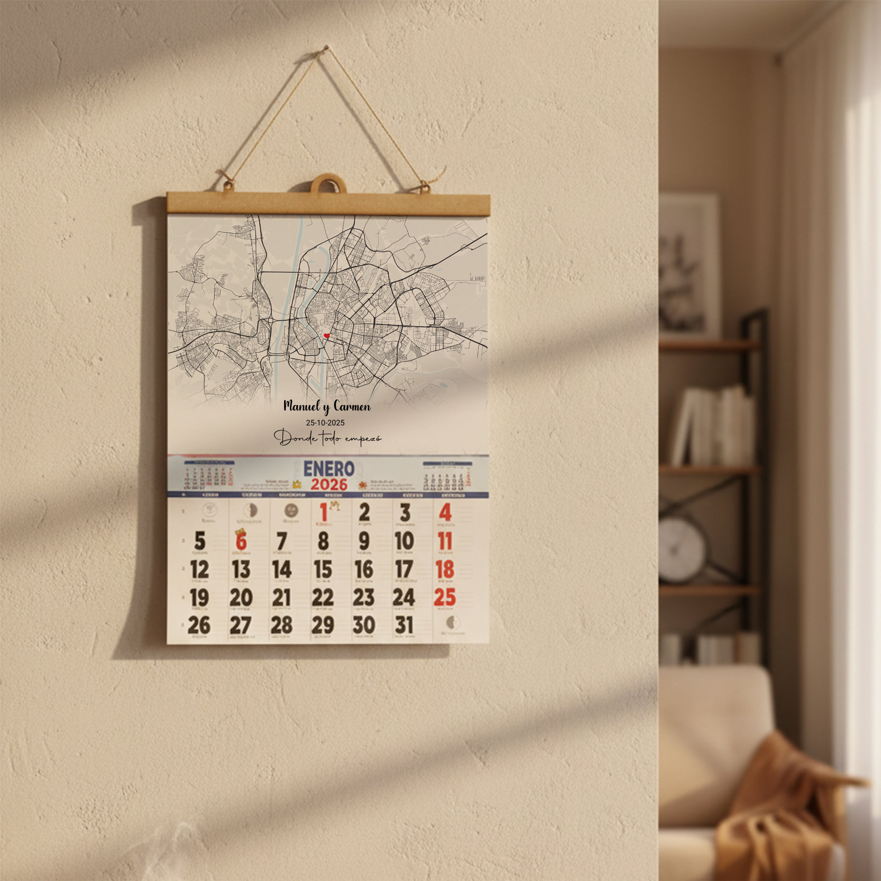 Lleva contigo ese lugar que te inspira durante todo el año. Nuestro calendario faldilla de 12 meses incluye un diseño especial donde podrás añadir el mapa de tu lugar favorito: tu ciudad natal, el destino de un viaje inolvidable o ese sitio que guarda un recuerdo único.