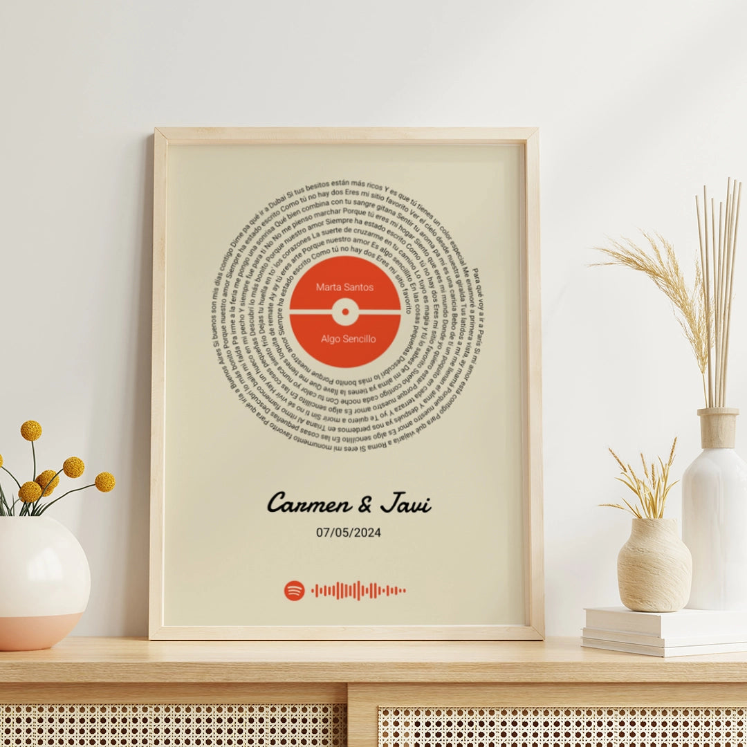 Convierte vuestra canción especial en una pieza de arte única con este vinilo personalizado en diseño vintage. Incluye un código escaneable de Spotify para que podáis revivir ese momento especial siempre que queráis. Perfecto para decorar o regalar en ocasiones especiales como aniversarios, bodas o San Valentín.